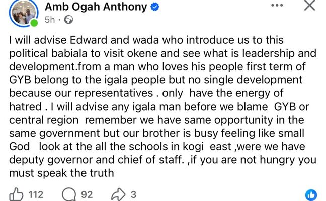 In a post that has since gained traction on social media, the chieftain urged Igala political stakeholders to reflect on governance outcomes rather than apportioning blame. He specifically called on certain leaders to “visit Okene and see what leadership and development look like,” suggesting that meaningful progress has been made in Kogi Central.