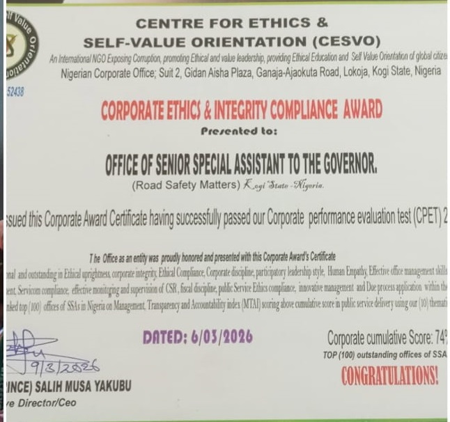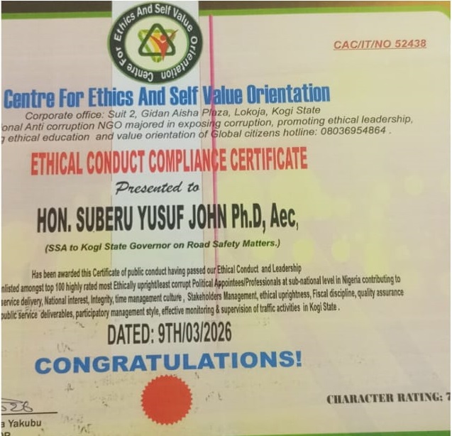 Dr Suberu Yusuf-John, Senior Special Assistant (SSA) to the Gov. Ahmed Ododo of Kogi on Road Safety Matters, has been honoured with the prestigious ethics and leadership award for his outstanding contributions to road safety in Nigeria.