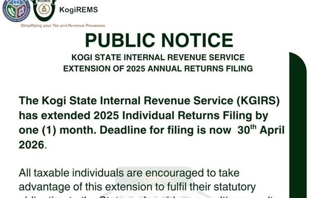 The Kogi State Internal Revenue Service (KGIRS) has announced a one-month extension for the filing of 2025 Individual Annual Returns, shifting the deadline to April 30, 2026.