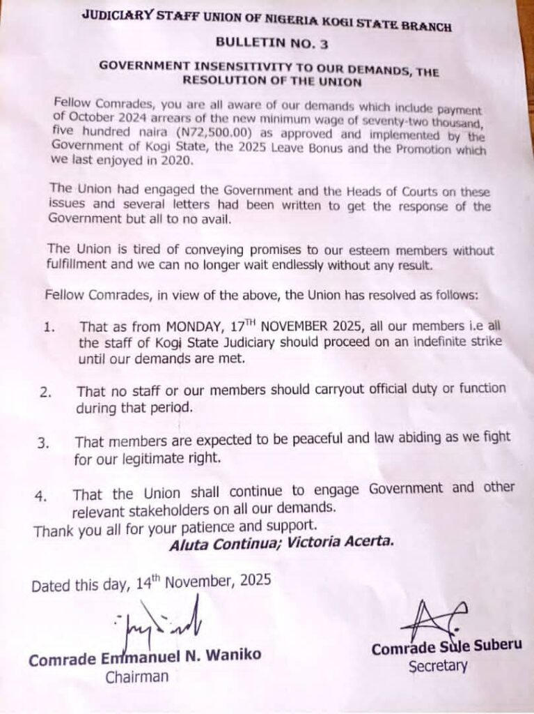 “Fellow Comrades, in view of the above, the Union has resolved as follows: That as from Monday, 17th November 2025, all our members i.e all the staff of Kogi State Judiciary should proceed on an indefinite strike until our demands are met.