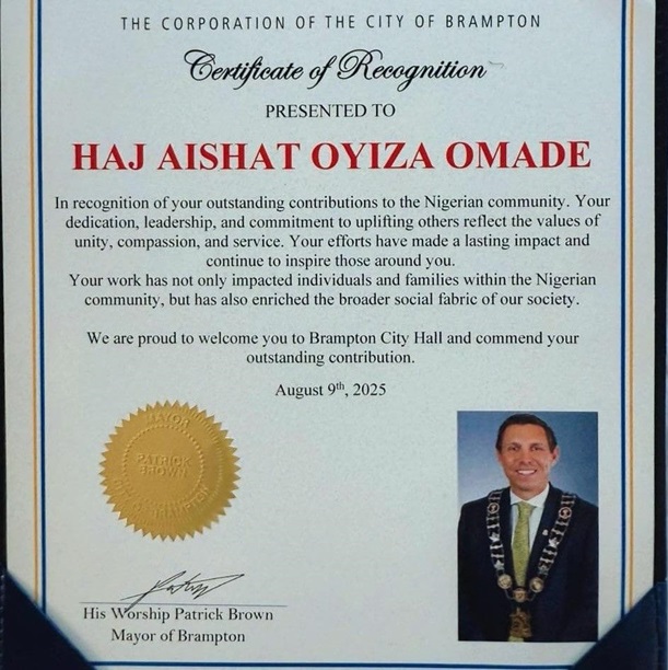 The first Certificate of Recognition was presented to her on August 9, 2025, by His Worship Patrick Brown, the Mayor of Brampton, Ontario, Canada. The award highlighted her consistent efforts in improving lives within her community by empowering the less privileged, funding small businesses, and supporting hundreds of women across Kogi State through the KOSSIPA platform.